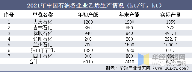 2021年中国石油各企业乙烯生产情况(kt/年,kt)